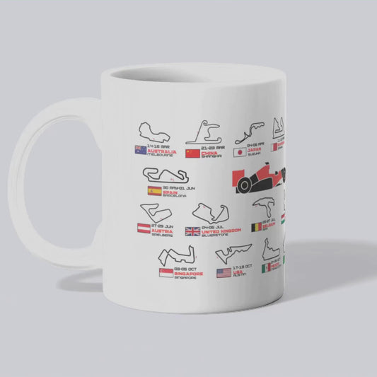 Taza Fórmula 1 con Calendario y Circuitos 2025. Regalo Original. Incluye Calendario de Bolsillo