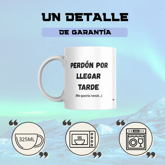 Taza divertida “Perdón por llegar tarde (no quería venir)” – Regalo sarcástico y original – Cerámica premium 325 ml